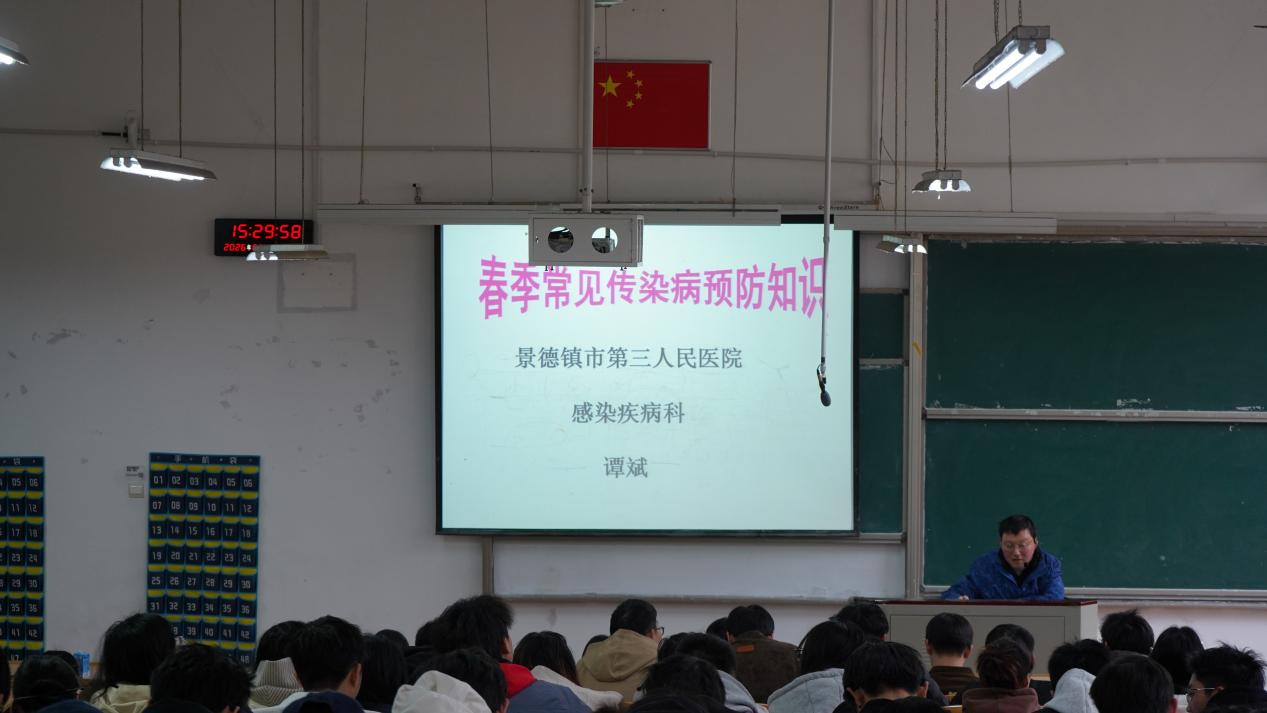 本网讯(文/胡静 魏佳丽 图/周唯)为进一步做好校园传染病预防工作,提高学生的公共卫生意识和自我保护能力。3月15日下午,景德镇市第三人民医院感染科副主任医师谭斌应邀在我校湘湖校区研阶01教室开展春季传染病防治专题讲座,共200余名师生到场聆听。讲座上,谭斌介绍了结核病、流行性感冒、水痘、风疹、流行性腮腺炎...