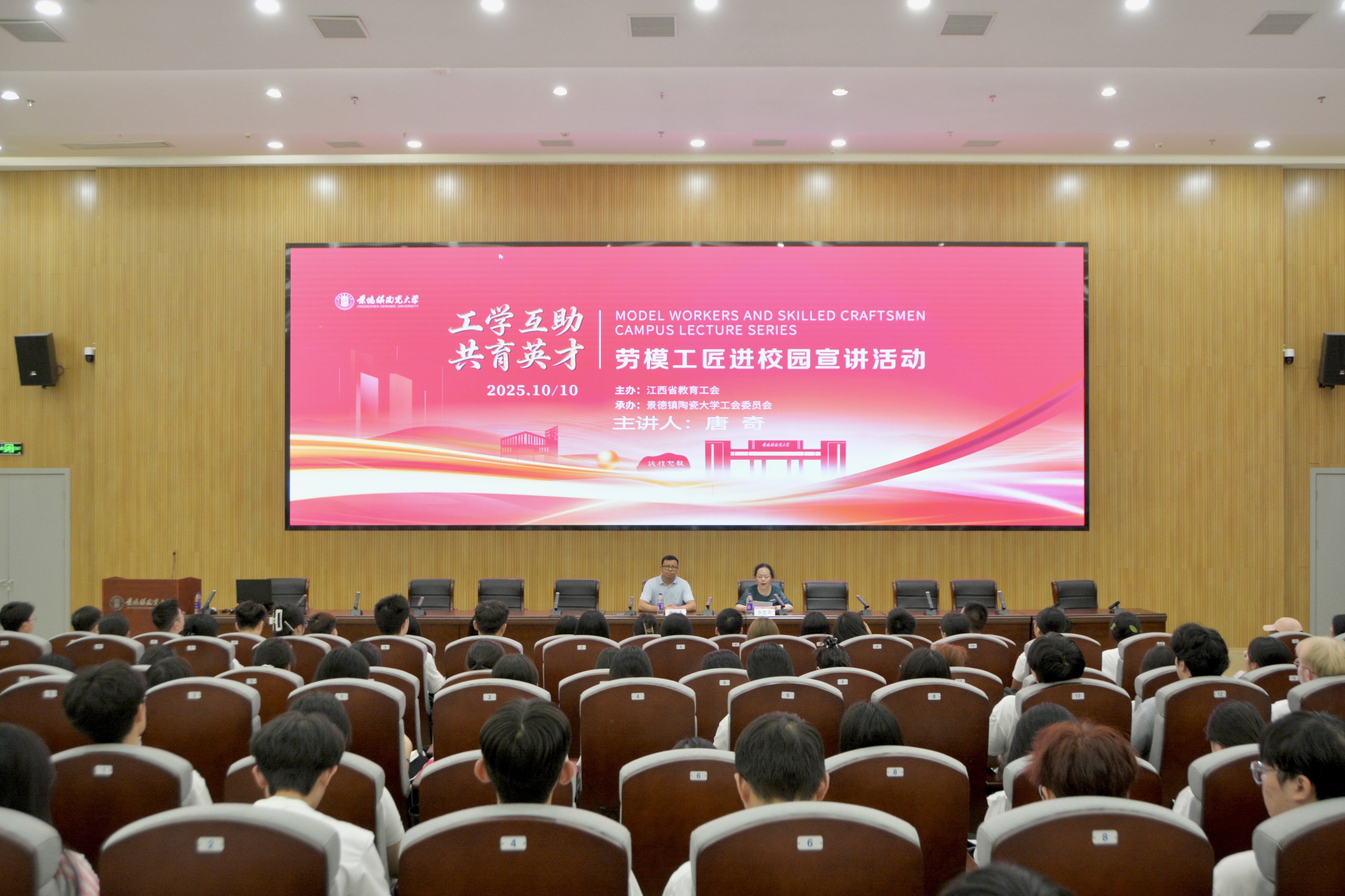 本网讯(文/乐宇婷 高阳阳 图/刘昌林)10月10日下午,我校在湘湖校区研究生实验楼一楼报告厅举办“工学互动 共育英才”宣讲主题活动,邀请全国劳动模范、全国五一劳动奖章、全国技术能手获得者,教授级高工,国务院政府特殊津贴专家唐奇来校宣讲。校工会主席李蔓华主持。师生代表约360人到场聆听。