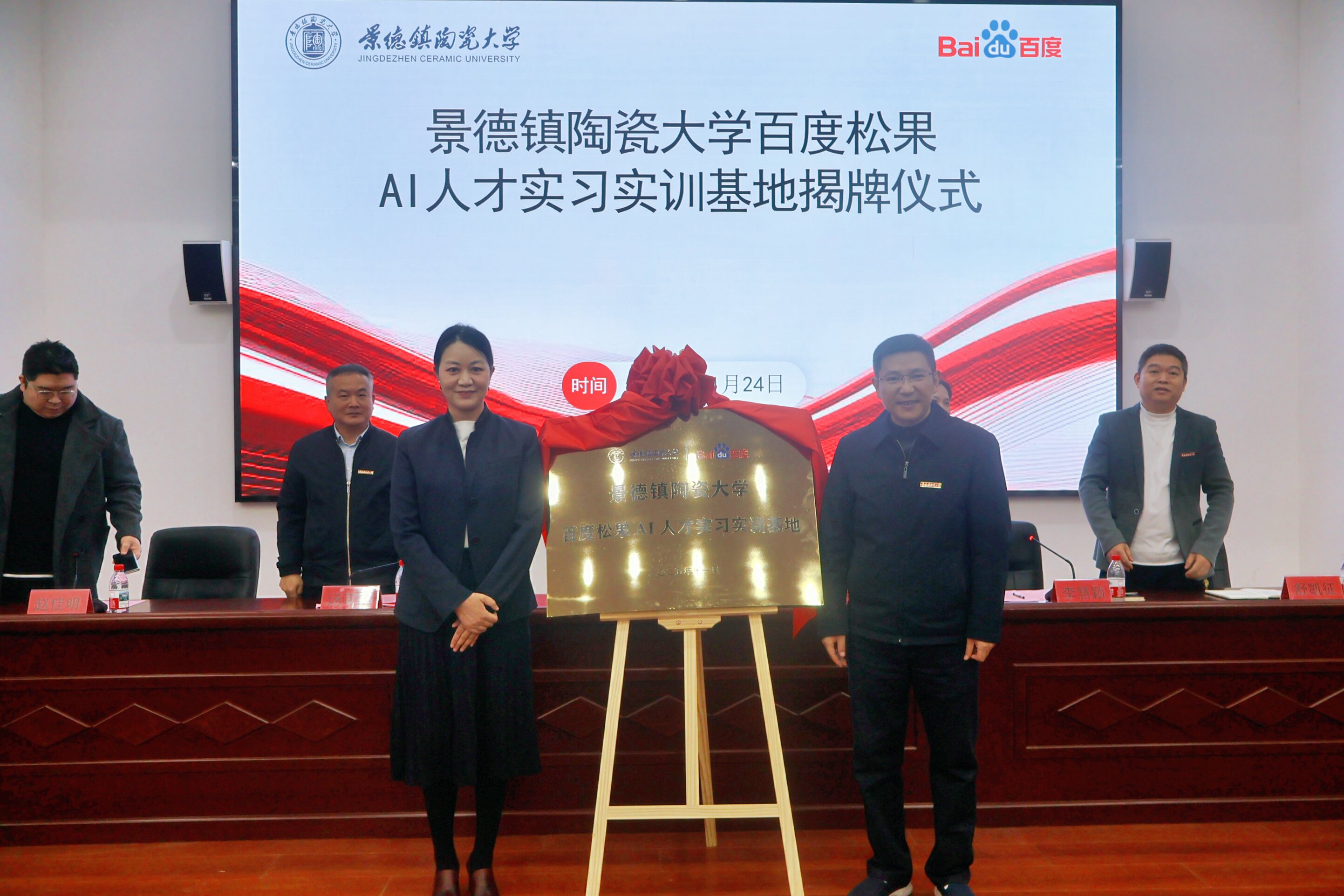 本网讯(文/肖予祺 图/刘欢 戴扬新)11月24日,景德镇陶瓷大学百度松果AI人才实习实训基地揭牌暨开班仪式在我校组阶03学术报告厅举行。校党委常委、副校长陈云霞,百度高校合作部副总监计湘婷出席揭牌仪式并讲话。信息工程学院、教务处、百度高校合作部相关负责人及我校师生代表参加揭牌仪式。