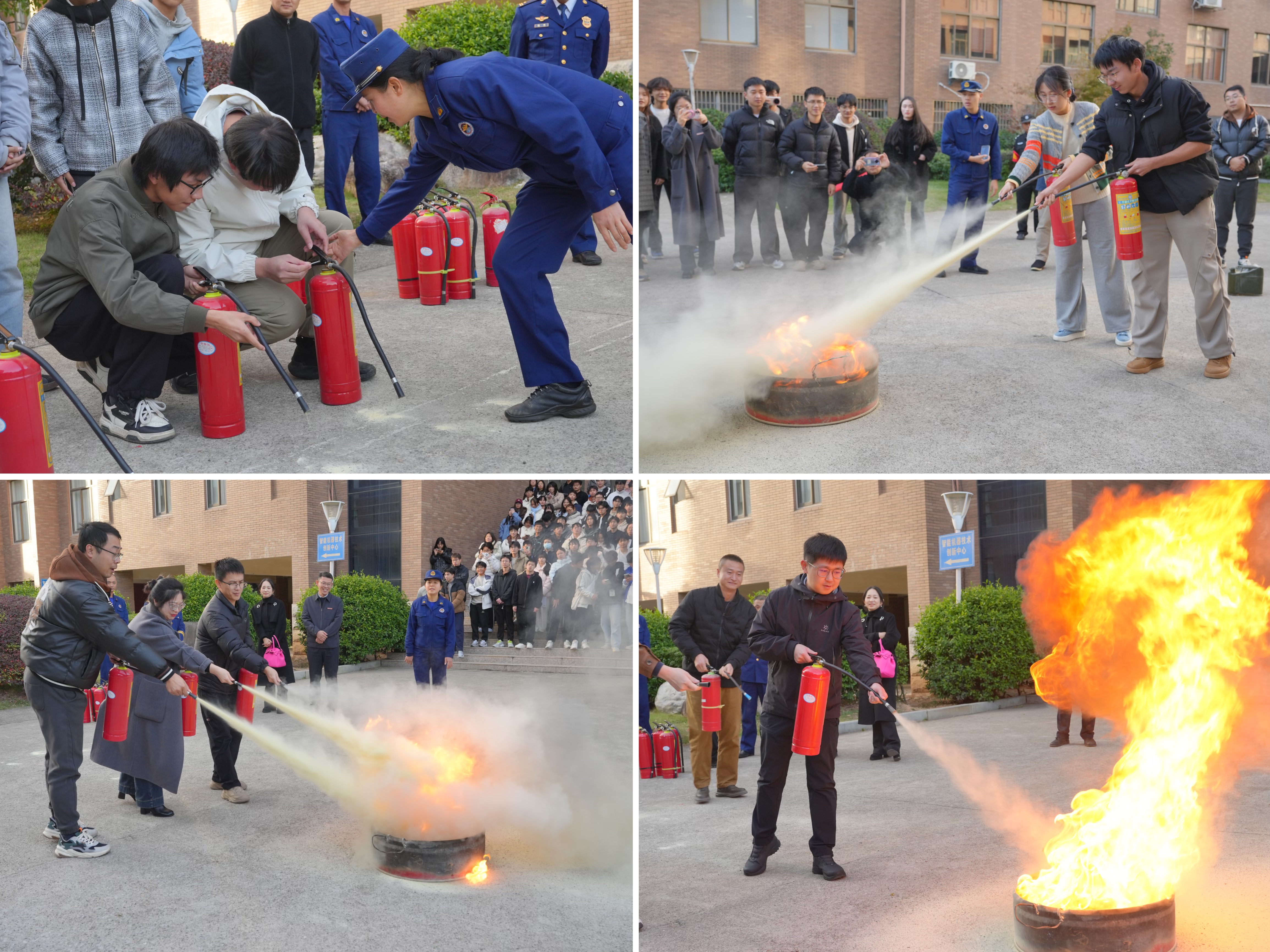 随后,还进行了消防实战演练。在陈坚及消防队员的专业指导下,党员和师生代表踊跃参与,亲身体验了灭火器“提、拔、握、压”的操作流程,对模拟火源进行了扑救实践,有效检验了师生对理论知识的掌握程度和初期火灾的扑救能力。
