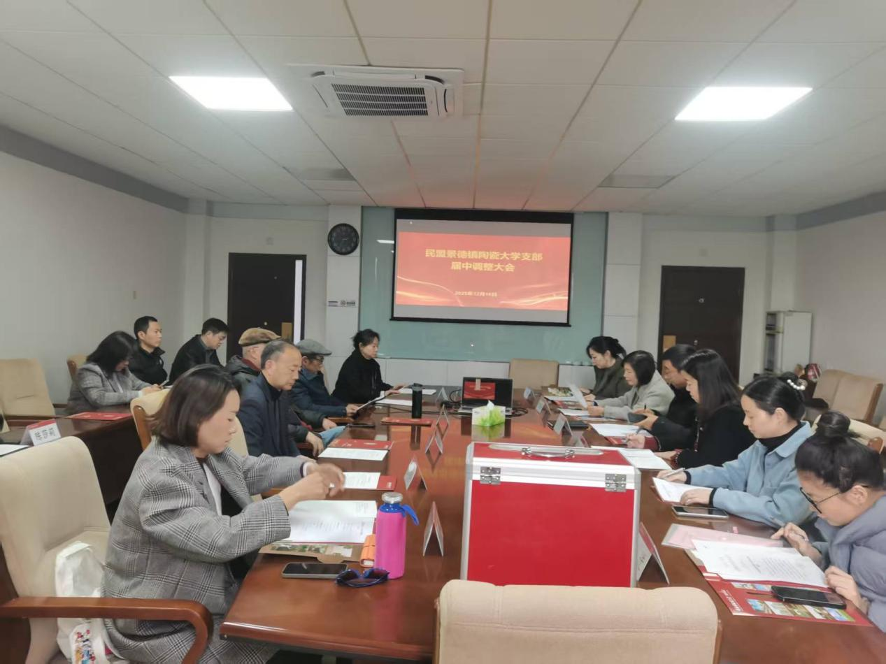 民盟景德镇陶瓷大学支部届中调整会议在湘湖校区行政楼703会议室举行。会议通过了邹思怿同志辞去支部主任委员职务的申请,并选举彭文治同志担任支部主委。彭文治表示,将在民盟市委会和学校党委的领导下,团结带领全体盟员,承前启后,务实进取,奋力谱写支部工作新篇章。