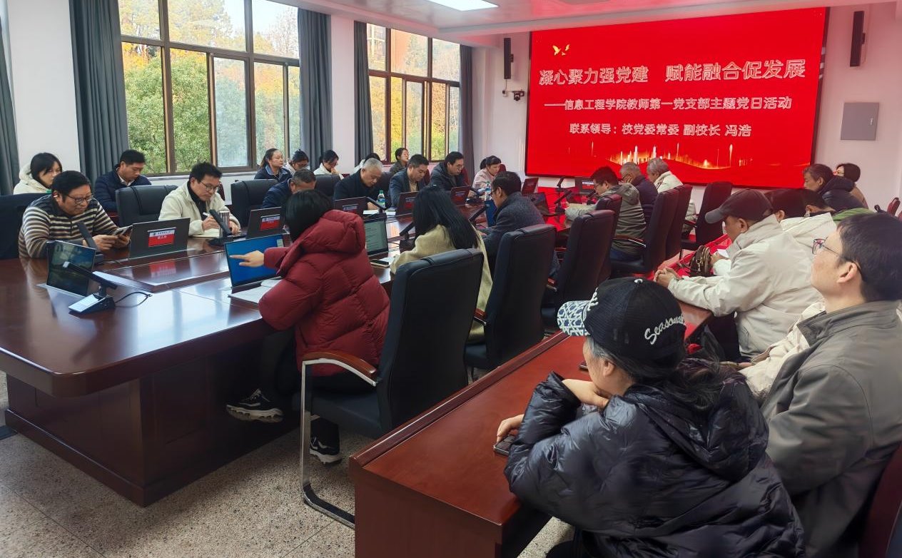 本网讯(信息工程学院 李步升)为深入学习贯彻党的创新理论,以“改革攻坚年、管理提效年、作风整顿年”为目标导向,扎实推进支部党建与业务深度融合,12月17日下午,信息工程学院教师第一党支部在学院智慧会议室开展“凝心聚力强党建,赋能融合促发展”主题党日活动。校党委常委、副校长冯浩出席会议并讲话,支部全体党员参加会议。
