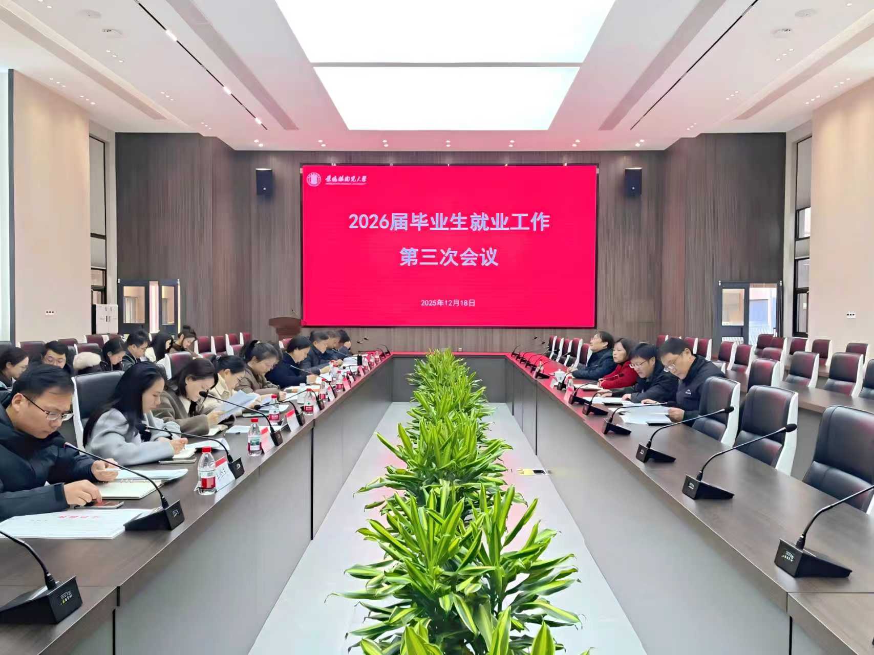 本网讯(招生就业处 程俊)12月18日,我校召开2026届毕业生就业工作第三次会议。会议学习传达了2026届全国普通高校毕业生就业创业工作会议和2026届全省普通高校毕业生就业创业工作会议精神,总结了前期工作成效,并对下一阶段重点任务进行部署。校党委常委、副校长胡银娇主持会议并讲话,研究生院、招生就业处、各学院(部、系)相关负责人及全体就业辅导员参加会议。