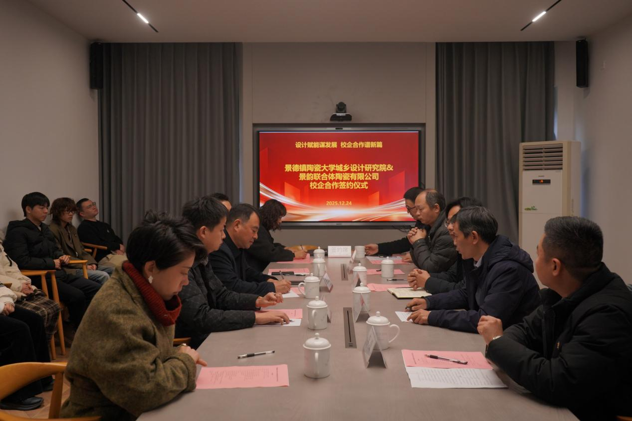 本网讯(设计艺术学院)为深入贯彻产教融合发展战略,构建校企协同育人新生态,12月24日上午,我校城市与乡村艺术设计研究院与景韵联合体陶瓷有限公司校企合作签约仪式在设计艺术学院二楼会议室举行。设计艺术学院党委书记段为松、景德镇景韵联合体陶瓷有限公司董事长易文金出席会议并讲话。城市与乡村艺术设计研究院执行院长、设计艺术学院副教授曹上秋,设计艺术学院师生代表及景德镇景韵联合体陶瓷有限公司相关负责人参会。