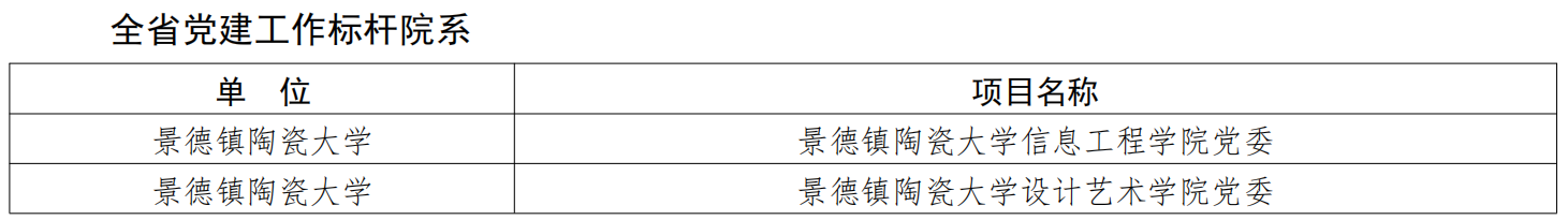 本网讯(党委组织部 梁超)近日,省委教育工委公布了全省第二批新时代高校党建示范创建和质量创优工作培育创建单位及对象名单,我校信息工程学院党委、设计艺术学院党委入选全省党建工作标杆院系培育创建单位,机械电子工程学院教师第一党支部、国家日用及建筑陶瓷工程技术研究中心党支部入选全省党建工作样板支部培育创建单位,材料科学与工程学院研究生第二党支部入选全省研究生样板党支部培育创建单位,机械电子工程学院博士研究生郑琦入选全省研究生党员标兵培育创建对象。
