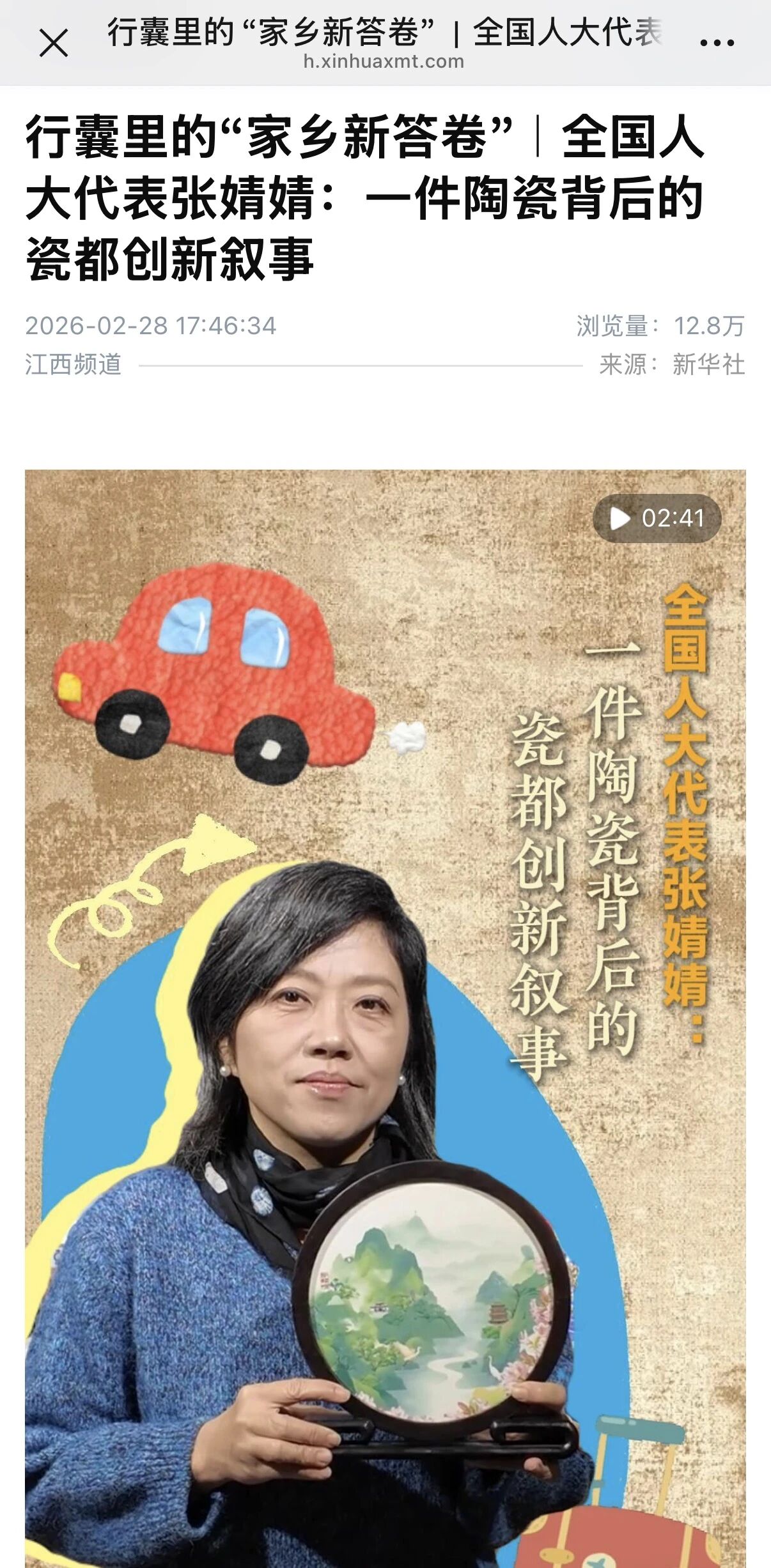 景德镇国家陶瓷文化传承创新试验区是2019年8月经国务院批准设立的国家级试验区。在张婧婧看来,传承与创新需要齐头并进。今年全国两会,她带着自己制作的“大美江西”数字陶瓷山水画来到北京。