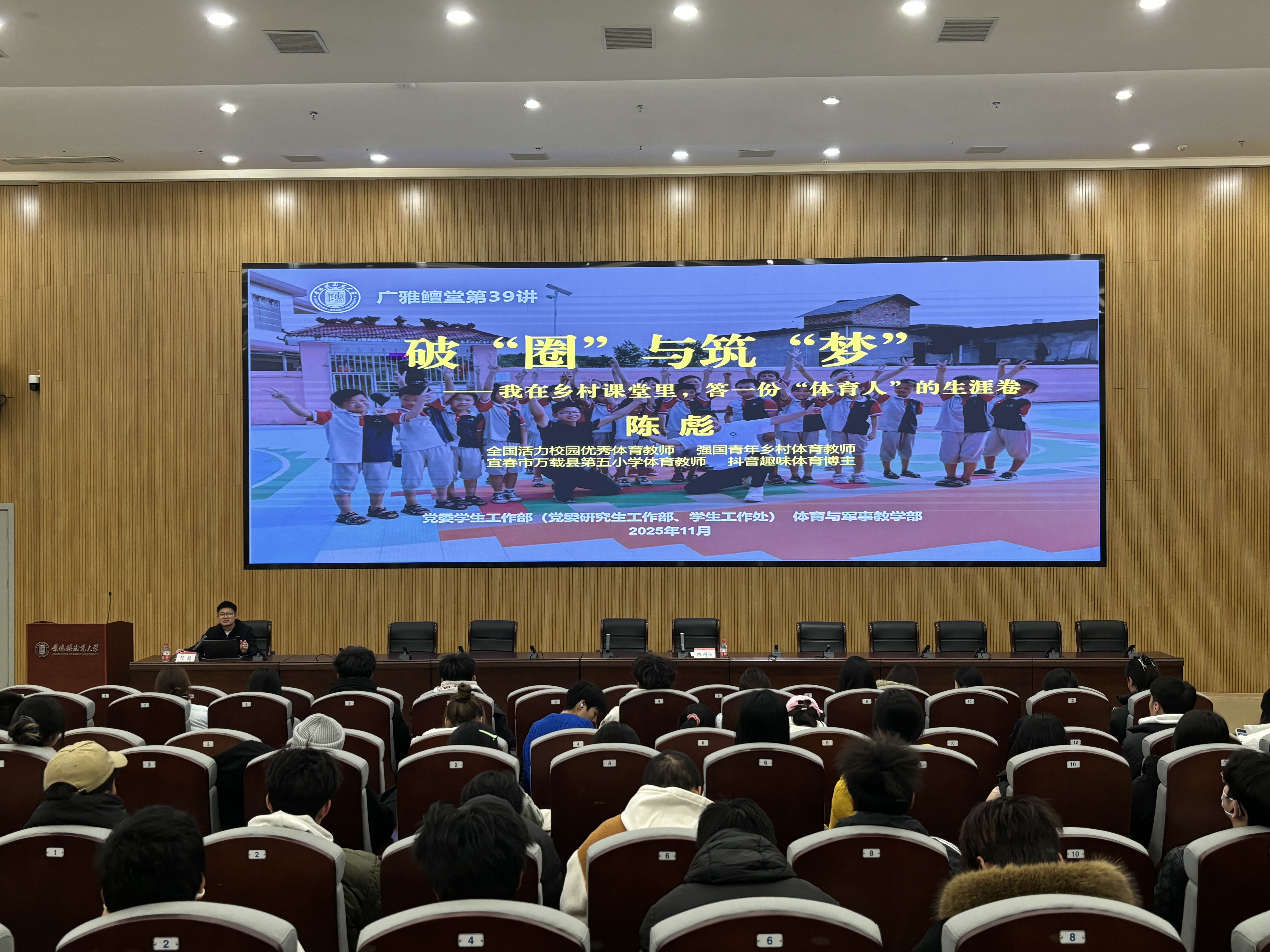 本网讯(体育与军事教学部 李娜)11月24日下午,我校2016届体育教育专业优秀校友、宜春市万载县第五小学体育教师陈彪应邀做客广雅鳣堂,在湘湖校区研究生实验楼一楼报告厅作题为《破“圈”与筑“梦”——我在乡村课堂里,答一份“体育人”的生涯卷》的讲座,共有300余名师生到场聆听。