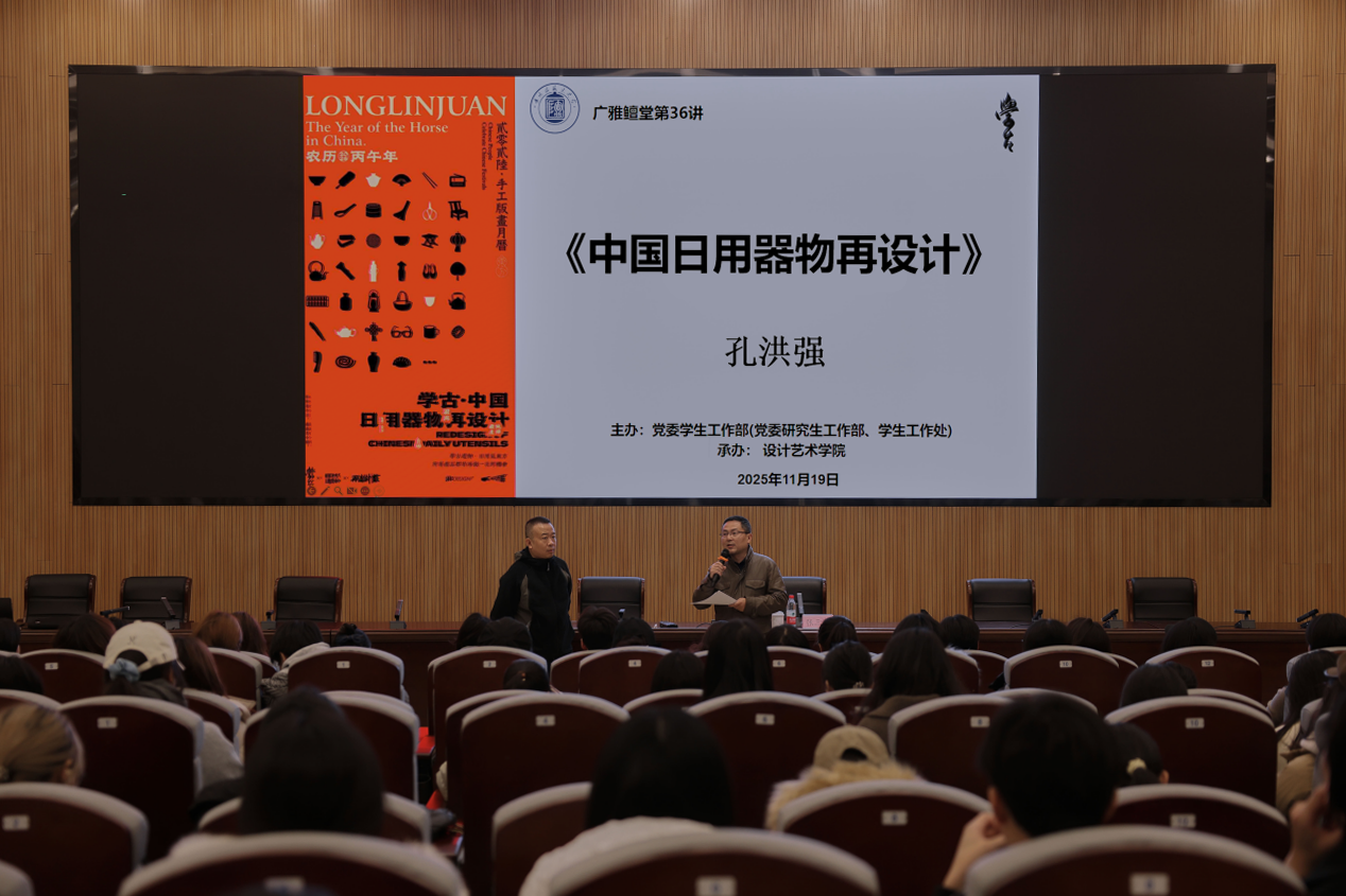 本网讯(设计艺术学院 许文静)11月19日下午,深圳市学古实业有限公司董事长孔洪强应邀做客我校广雅鳣堂,在研究生艺术实验大楼一楼报告厅作题为《中国日用器物再设计》的讲座,师生代表共计270余人到场聆听。