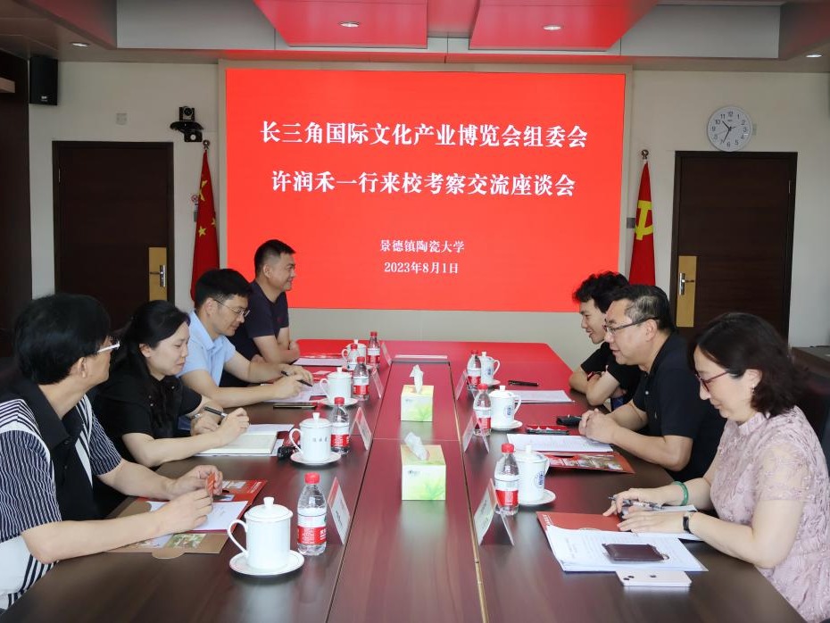 本网讯(张小将)8月1日上午,长三角国际文化产业博览会组委会执行秘书长、上海市国际展览(集团)有限公司副总裁许润禾一行来校考察。校党委委员、副校长陈云霞接待了许润禾一行,并在行政楼801会议室召开座谈会。党委(校长)办公室、美术学院、博物馆等单位负责人参加座谈会。座谈会上,与会人员观看了我校宣传片《陶瓷...
