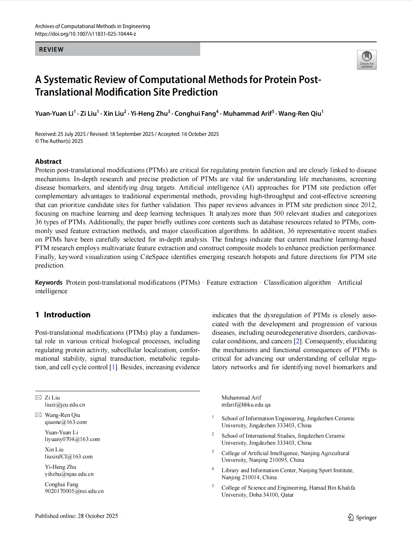 本网讯(信息工程学院 刘子)近日,我校信息工程学院邱望仁教师团队在工程技术领域顶级期刊《Archives of Computational Methods in Engineering》(中科院1区Top,IF=12.1,CiteScore:27.4)发表学术论文《A Systematic Review of Computational Methods for Protein Post-Translational Modification Site Prediction...