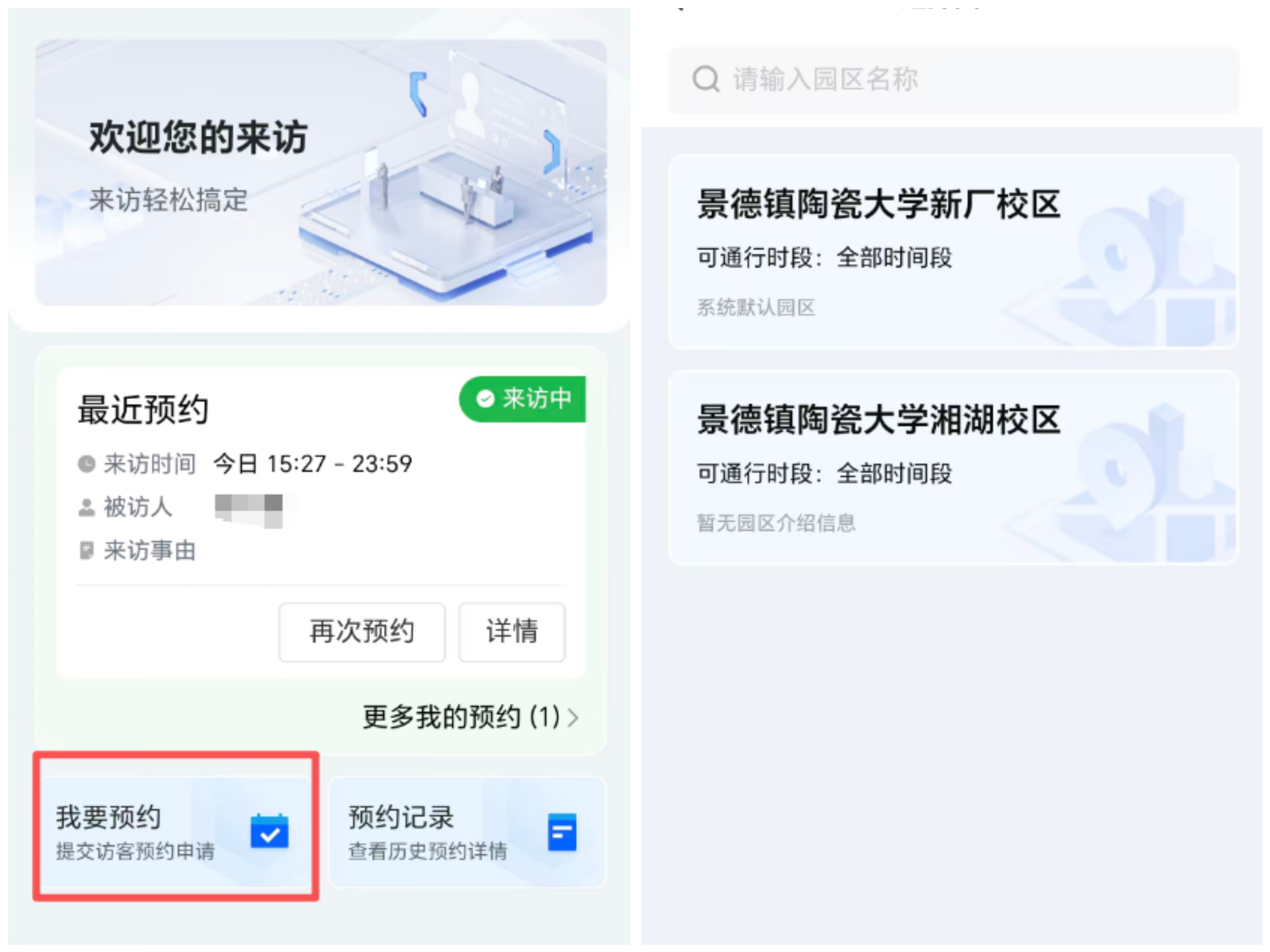 4、访客注册完成后点击我要预约进行预约,首先进行校区的选择,需要访问哪个校区就选择哪个校区。