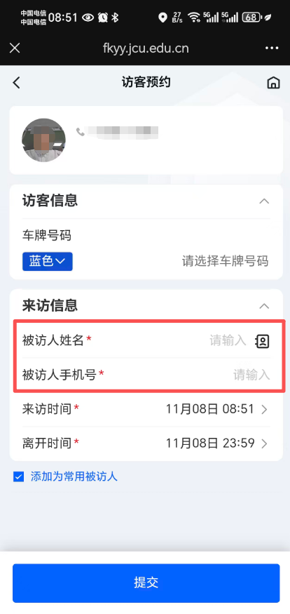 3、点击跳转后首先是访客注册界面,访客需要手动上传自己的照片(只需要上传一次即可,而且务必进行上传,否则流程审批通过后访客人脸无法下发到校门口人脸门禁),之后输入姓名、手机号后点击提交即可完成注册。