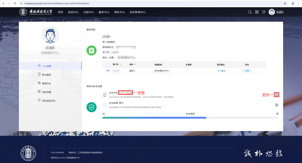 ②登录一站式服务大厅,点击右上角头像/姓名进入个人中心(https://ecampus.jcu.edu.cn/main.html#/personal-center/information),查看或更换手机号。