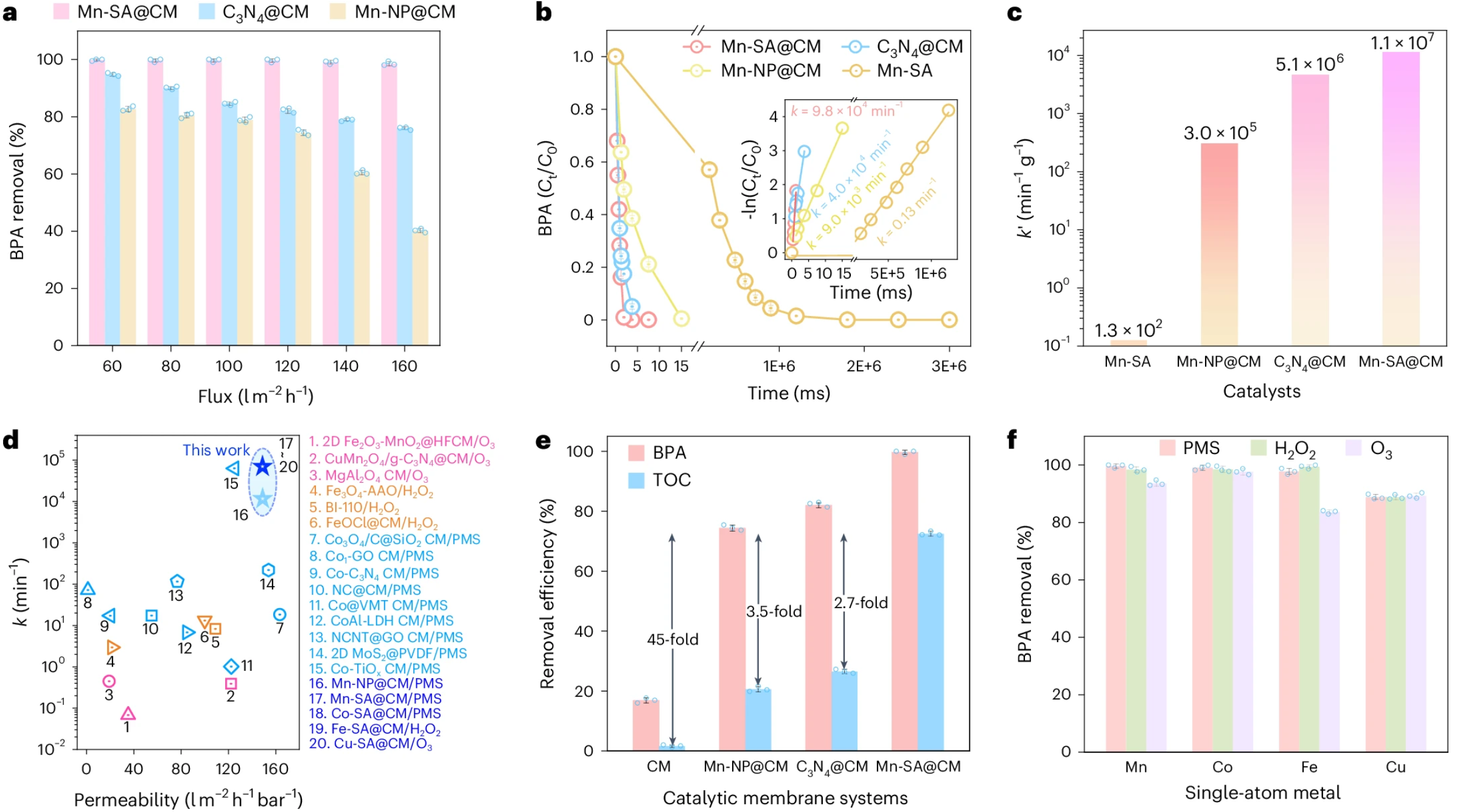 图2. Mn-SA@CM的催化性能。a. 不同通量与催化体系中BPA去除效率;b. 不同反应时间BPA去除效率及其一级动力学常数;c. 不同催化体系的归一化动力学常数;d. 与已有文献的渗透性与降解动力学对比;e. 不同催化体系中BPA与TOC去除效率;f. 不同金属单原子与氧化剂中BPA去除效率。