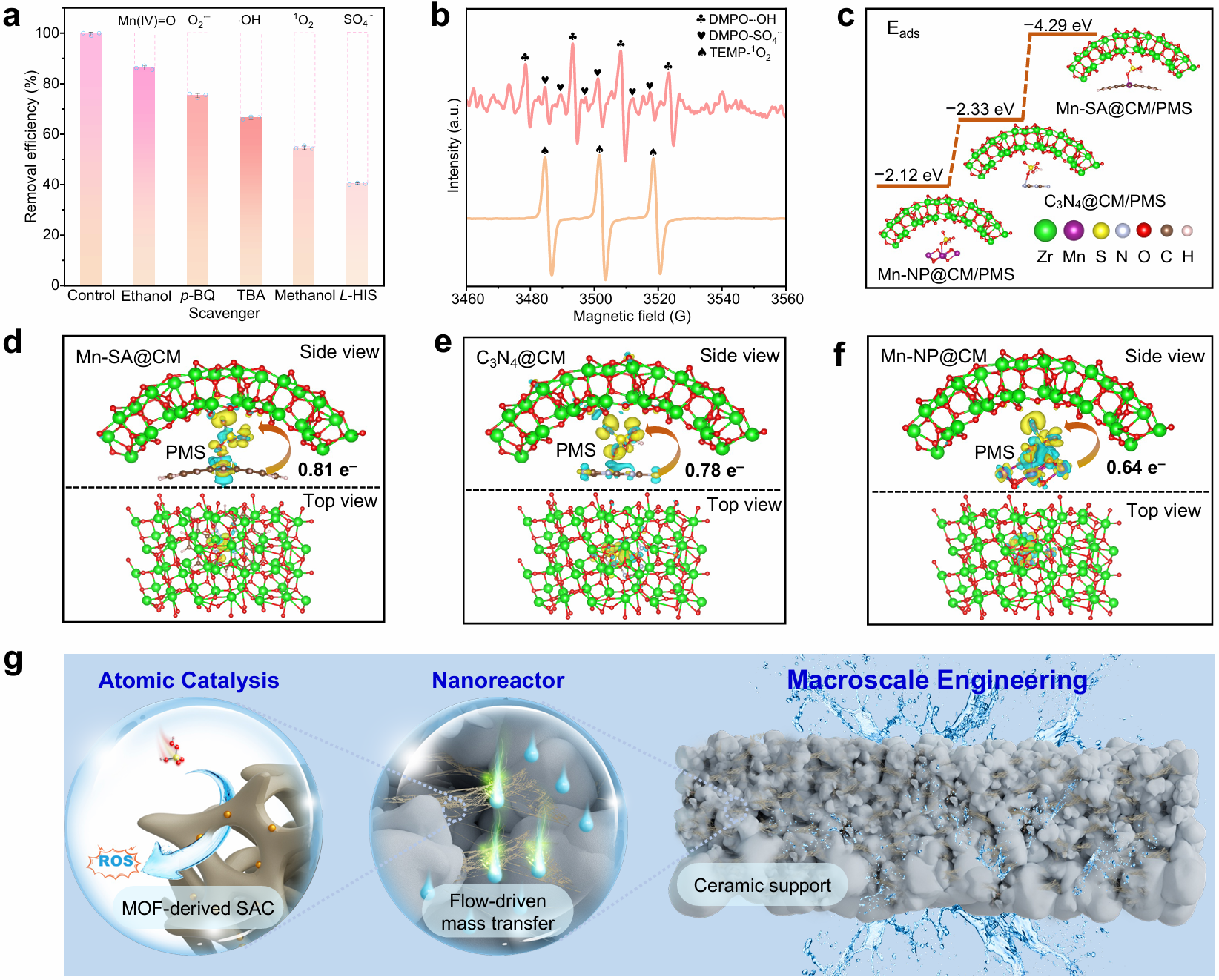 图3. Mn-SA@CM/PMS去除污染物机理。a. 淬灭实验;b. EPR图谱;c. 不同催化体系吸附能分析;d-f. 不同催化体系中Bader电荷分析;g. Mn-SA@CM的分层组装及去污示意图。