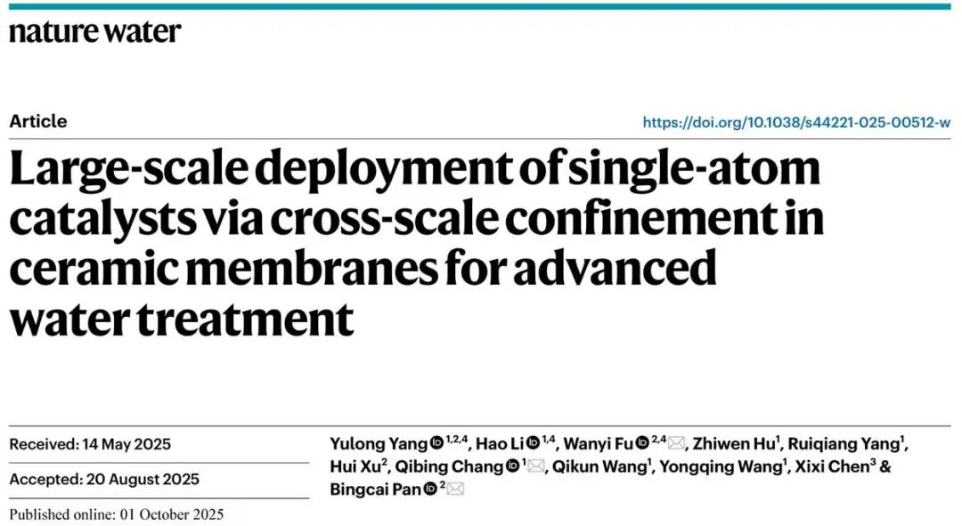 本网讯(材料科学与工程学院)2025年10月1日,我校材料科学与工程学院青年教师杨玉龙以第一作者身份在Nature子刊《Nature Water》(IF=24.1)上发表了题为“Large-scale deployment of single-atom catalysts via cross-scale confinement in ceramic membranes for advanced water treatment”的研究论文(DOI:10.1038/s44221-025-00512-w)。该成果以景德镇陶瓷大学为第一署名单位,联合南京大学、清华大学。我校2022级硕士研究生李豪为共同第一作者,常启兵教授为共同通讯作者。这是我校首次以第一单位身份在Nature子刊发表高水平研究成果。