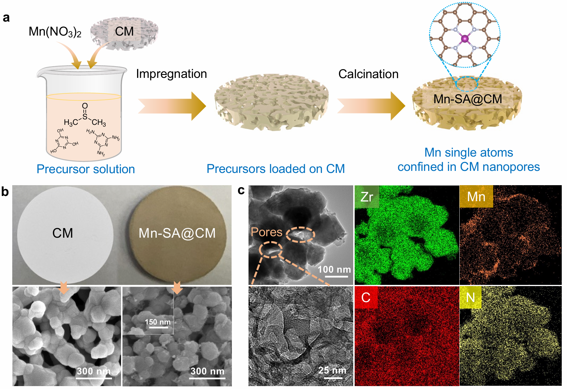 图1. Mn-SA@CM的制备与微/纳结构表征。a. Mn-SA@CM的制备工艺;b. Mn-SA@CM的光学照片与断面SEM照片; c. Mn-SA@CM的TEM与EDS照片。