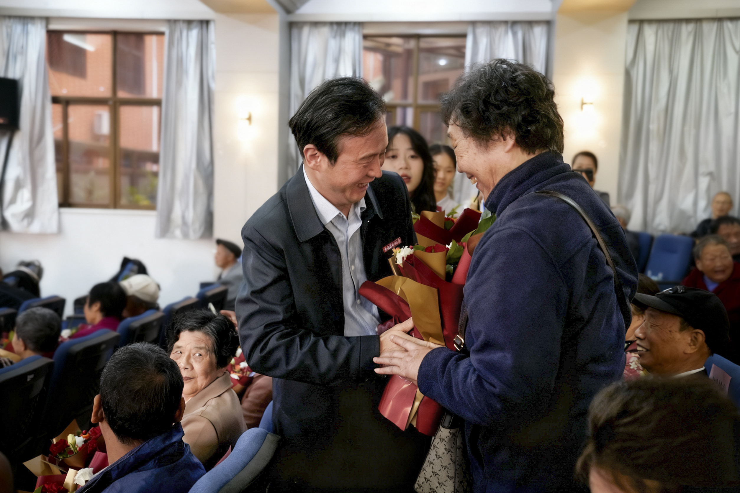 会上,王海波宣读了学校2025年寿星名单,今年我校共有56位寿星。校领导为寿星献花并送上真挚祝福。