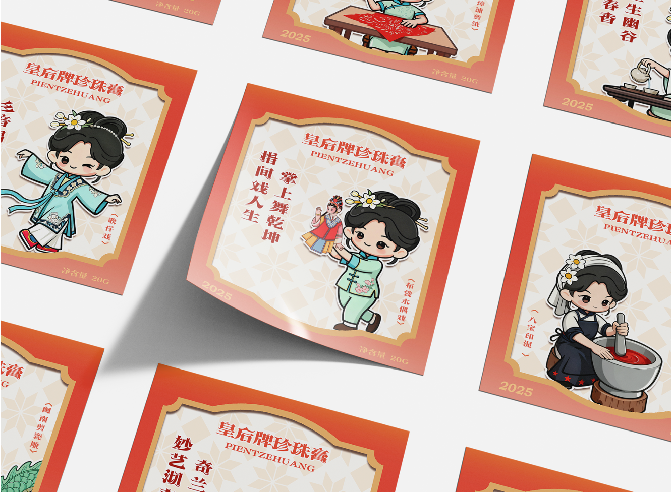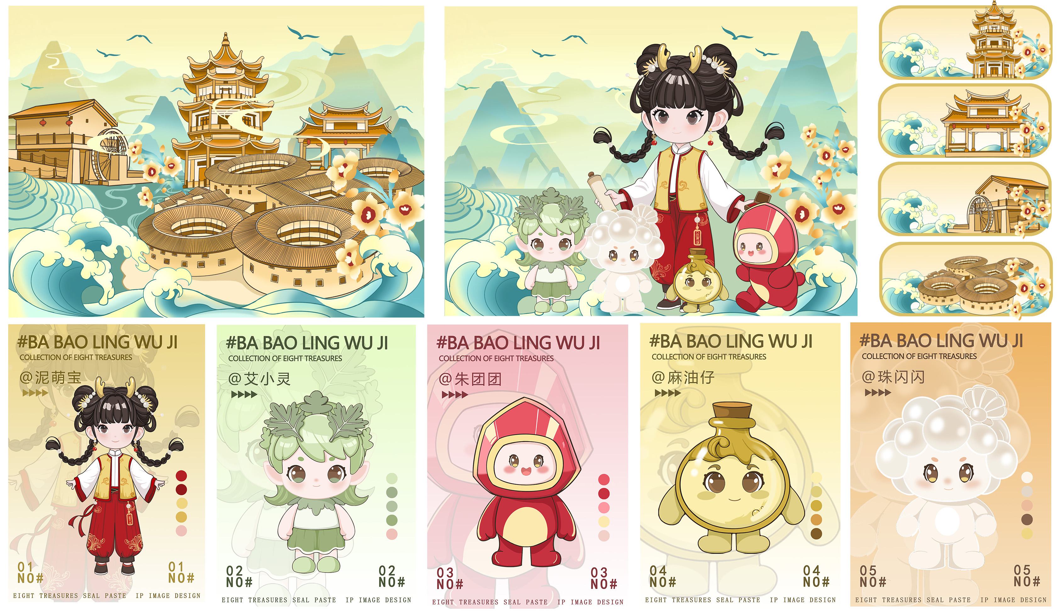 设计作品《八宝灵物集》源自国家级非物质文化遗产“漳州八宝印泥”,高度凝练了“印信传世、历久弥新”的文化内涵,将其四种核心原料幻化为守护灵物,设计出“珠闪闪”象征莹润光泽、“朱团团”代表印章权威、“麻油仔”体现温润历久、“艾小灵”赋予防蛀韧劲等多个自主产权的IP形象。