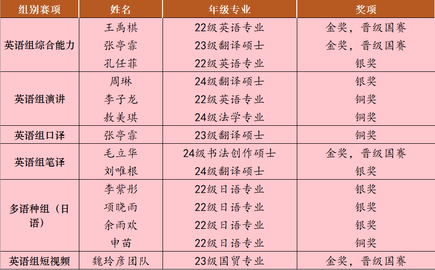 此次大赛设置英语组、多语种组和国际中文组三大组别,其中英语组和多语种组采用校级初赛(校赛)、省级复赛(省赛)、全国决赛(国赛)三级赛制。英语组校赛和省赛设置国际传播综合能力、演讲、笔译、口译、短视频赛项。大赛以“理解当代中国”为主题,致力于为国家培养更多兼具家国情怀、全球视野与专业本领的高水平国际化人才,着力提升我国国际传播人才的自主培养能力,更好地服务国家参与全球治理、推动构建人类命运共同体的战略需求,成功入选教育部中国高等教育学会发布的“全国普通高校大学生竞赛排行榜”,是教育部认可的权威学科竞赛之一。