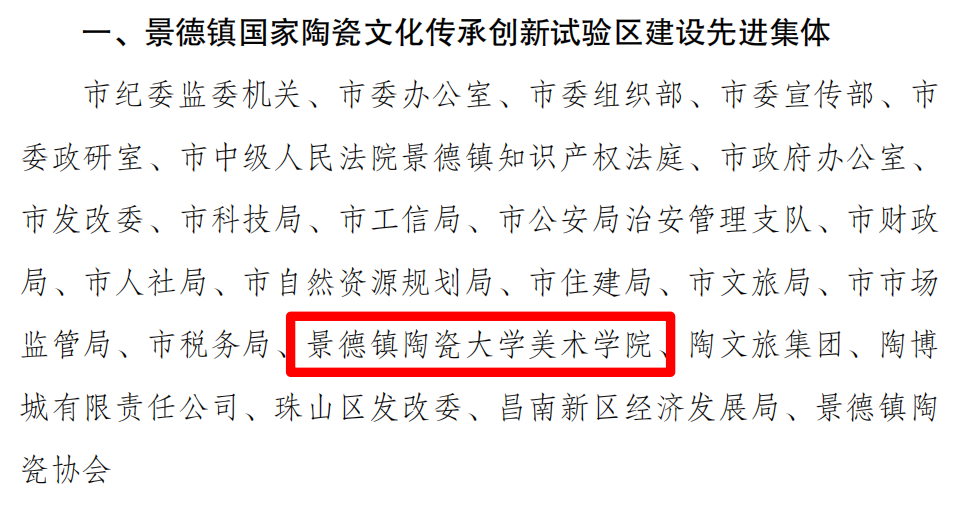 本网讯(发展规划处 郑君洁)近日,中共景德镇市委、景德镇市人民政府联合印发《关于表彰景德镇国家陶瓷文化传承创新试验区建设先进集体和先进个人的决定》(景字〔2025〕50号),对景德镇国家陶瓷文化传承创新试验区建设先进集体和先进个人予以表彰。我校美术学院荣获景德镇国家陶瓷文化传承创新试验区建设先进集体,国际学院副院长、中国非物质文化遗产保护协会陶瓷分会秘书长李超获评先进个人。