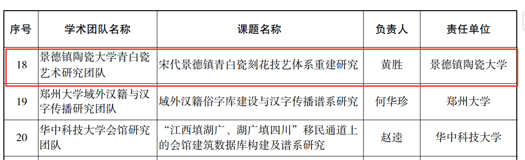 本网讯(科学技术处)近日,全国哲学社会科学工作办公室公示了2025年国家社科基金冷门绝学研究专项立项名单,我校黄胜教授领衔的景德镇陶瓷大学青白瓷艺术研究团队《宋代景德镇青白瓷刻花技艺体系重建研究》和陈宁教授《近代中国陶瓷典籍的搜集、整理与数字化研究(1840—1949)》分别成功获批2025年度国家社会科学基金冷门绝学研究专项学术团队和学者个人项目。本次国家社科基金冷门绝学研究项目共立项130项,江西省立项3项,我校立项数位居全省第一。