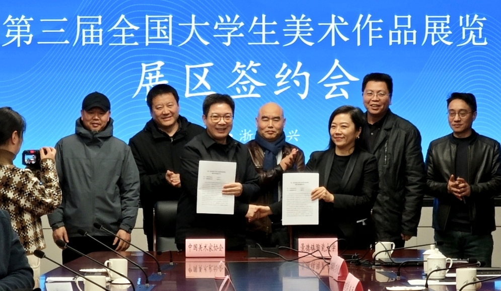 本网讯(美术学院)1月30日,全国大学生美术作品展展区签约仪式在浙江嘉兴红船干部学院举行,我校获得工艺美术·陶瓷艺术展区的举办权,副校长张婧婧、江西省文联副主席杨震,中国美术家协会公共艺术委员会主任、江西省美术家协会主席吕品昌、江西师大美术学院院长夏学兵,美术学院副院长赵兰涛、博物馆副馆长刘伟出席签约仪式。