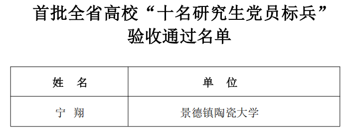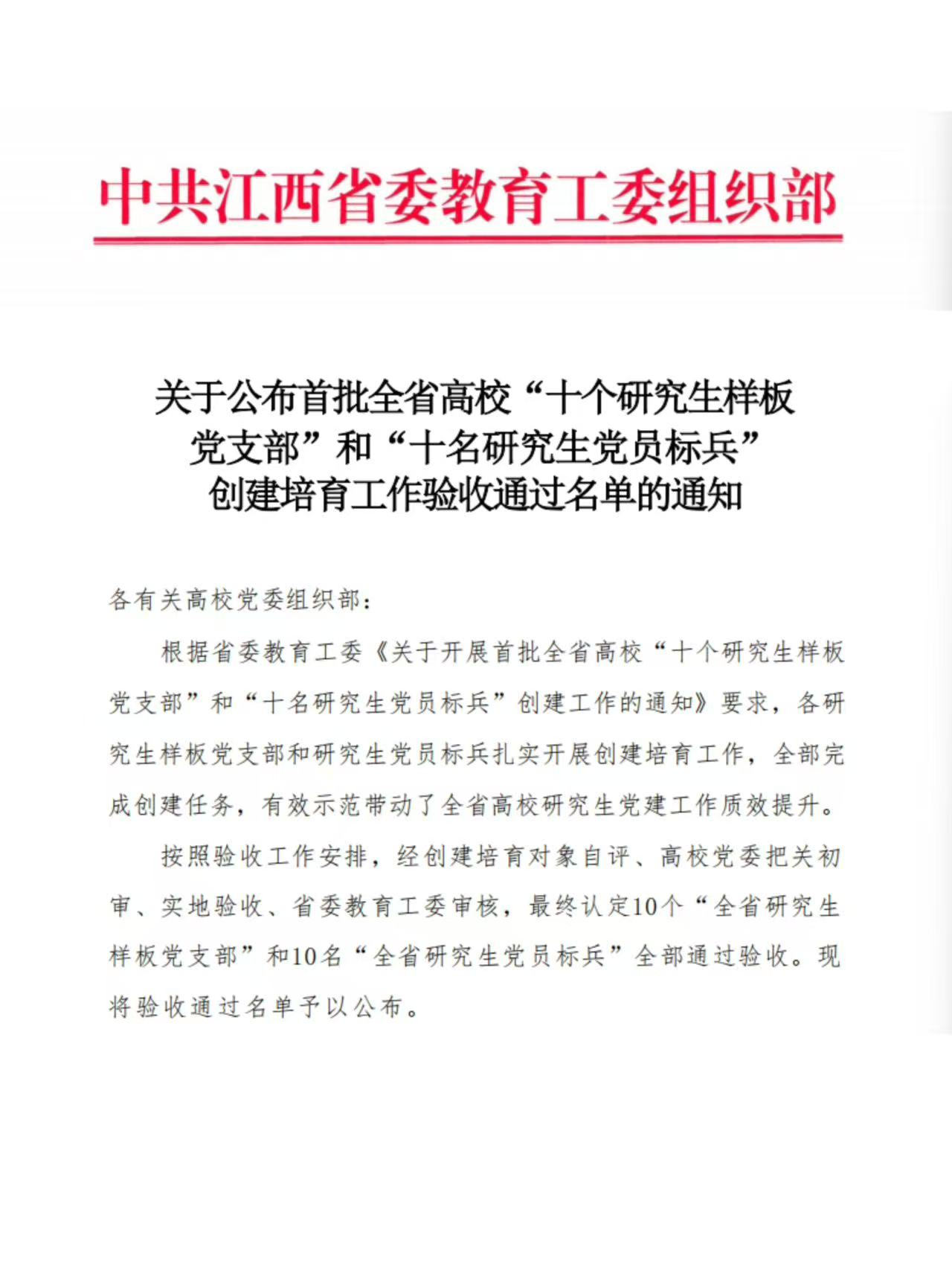 本网讯(党委组织部 熊果果)近日,省委教育工委公布首批全省高校“十个研究生样板党支部”和“十名研究生党员标兵”创建培育工作验收通过名单。我校设计艺术学院研究生第四党支部和机械电子工程学院2025届博士研究生宁翔顺利通过省级验收。