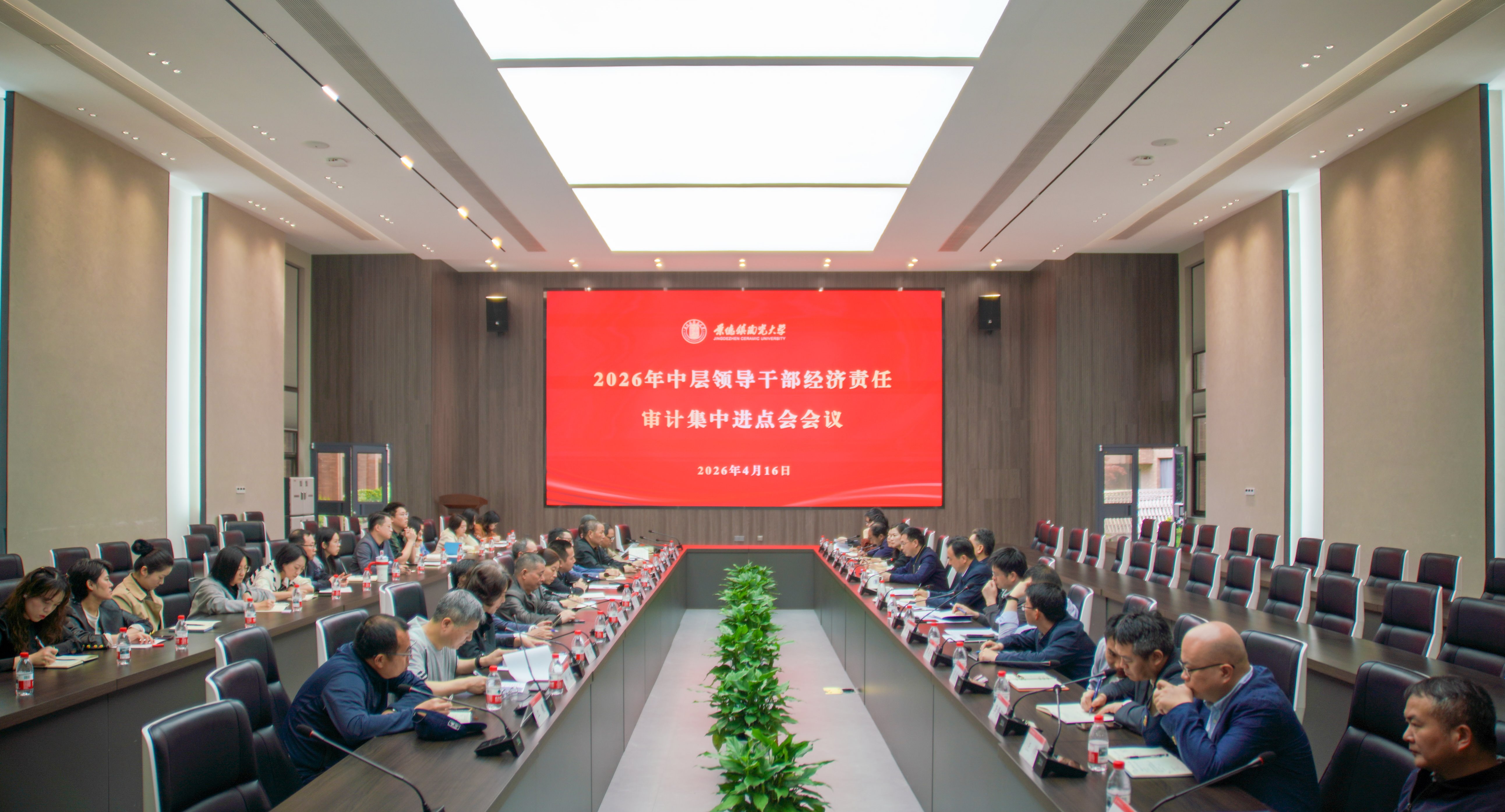 本网讯(审计处 黄苗)4月16日,学校2026年中层领导干部经济责任审计集中进点会在湘湖校区综合会议厅召开。校党委常委、纪委书记、省监委驻校监察专员王金海出席会议并讲话。校党委常委、党委组织部部长杨志民主持会议,相关职能部门领导、被审计领导干部、被审计单位现任领导干部及联络员、审计处相关工作人员等40余人参加会议。
